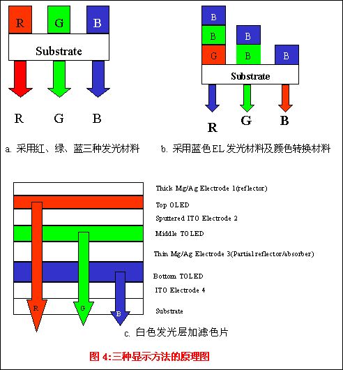 获得全色OLED显示器的方法有三种: