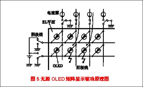 平板显示的驱动电路与LCD一样,可分为无源和有源驱动两类,即直接寻址和薄膜晶体管(TFT)矩阵寻址两类。前者使用普通的矩阵交叉屏,在ITO电极Xi加上正电压,金属电极Yj加上负电压,则在其交叉点像元(Xi,Yj)上即能得到发光(如图所示的一个交叉像元);后者要求每一个发光单元都由TFT寻址独立控制,工艺非常复杂。无源矩阵驱动的扫描原理如图5所示。其基本过程是,对某一行需要发光像元的相应列都加上正电压,不需要发光像元的相应列都接地,当该行电极接地时则该行需要发光的像元都能发光而其他的像元都不发光。如此逐行扫描,就可得到所需显示的图像。